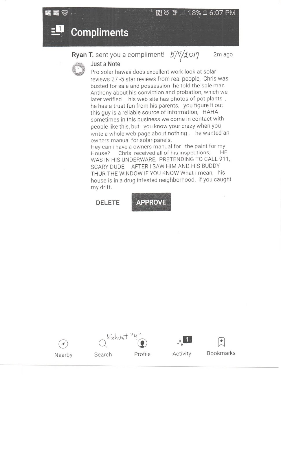 My last post was "Pro Solar Hawaii Gets Sued By Customer For Libel Per Se". In my last post, I gave you all a glimpse, no. It was a complete clearly visible case of the libel that anyone with a 1st-grade education can see was done with clear malice and intent to cause me personally extreme harm. Unlike Pro Solar Hawaii's case against me, I show clear, unmistakable evidence of Ryan Thompson's guilt. Here is what I posted to Yelp that Ryan felt was so bad that he had to libel me in such an extremely vile manner.